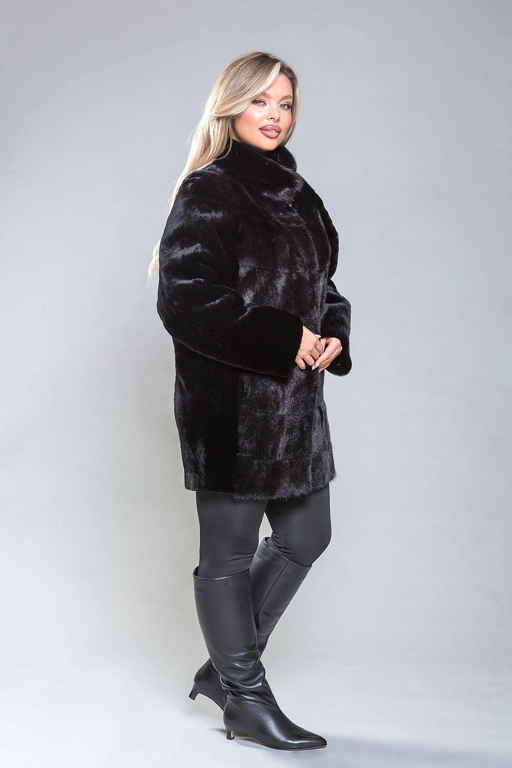 Элегантное полупальто из высококачественной овчины, дополненное изысканным воротником-стойкой. Передняя часть изделия украшена роскошной норкой, выполненной в технике поперечных пластин. Воротник из норки фиксируется с помощью декоративной пуговицы, а сама модель застегивается на клипсы. Карманы и борта изготовлены из натуральной замши, а карманы оснащены магнитами. Длина изделия составляет 98 см. Благородный черный цвет легко сочетается с любым стилем, делая эту шубку идеальным выбором для ценителей премиум-класса.