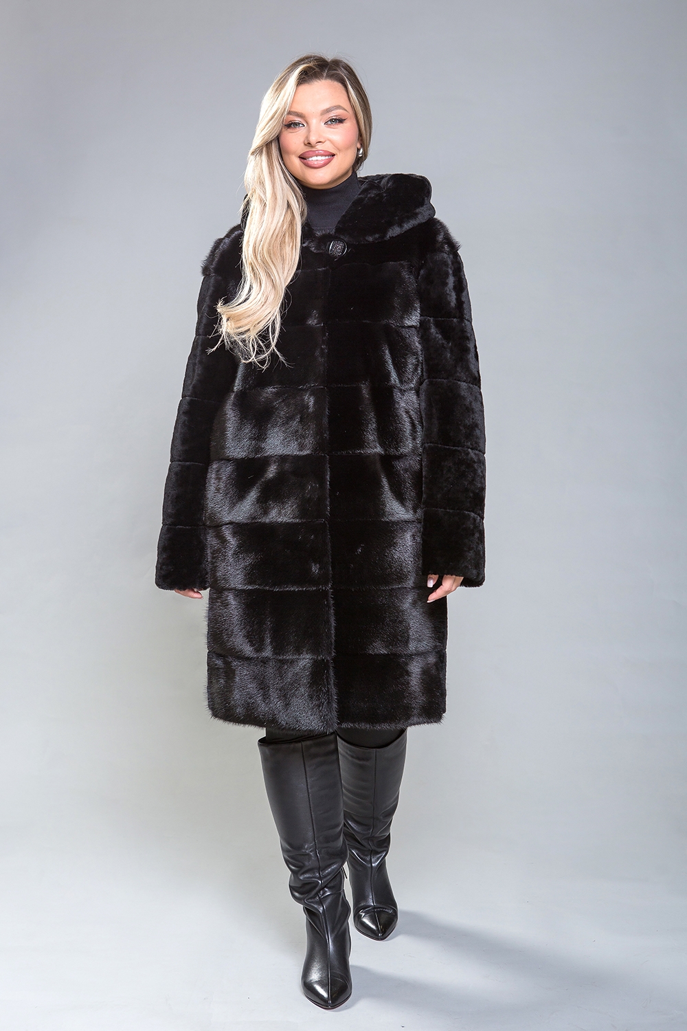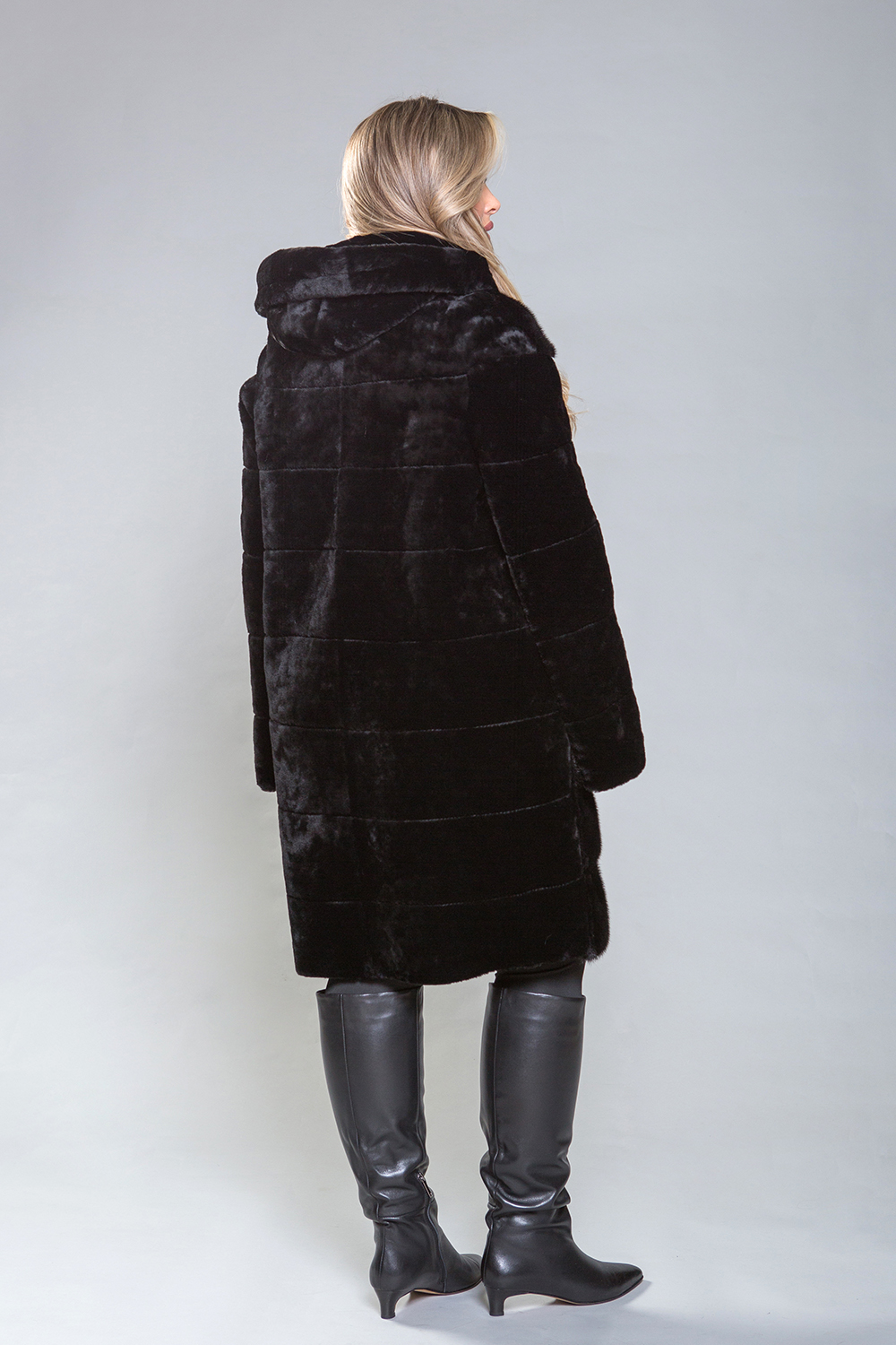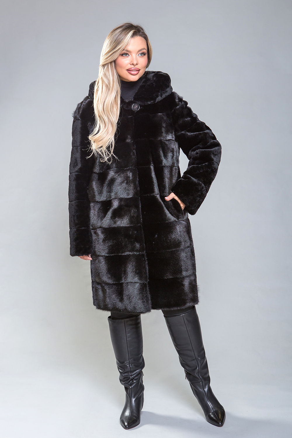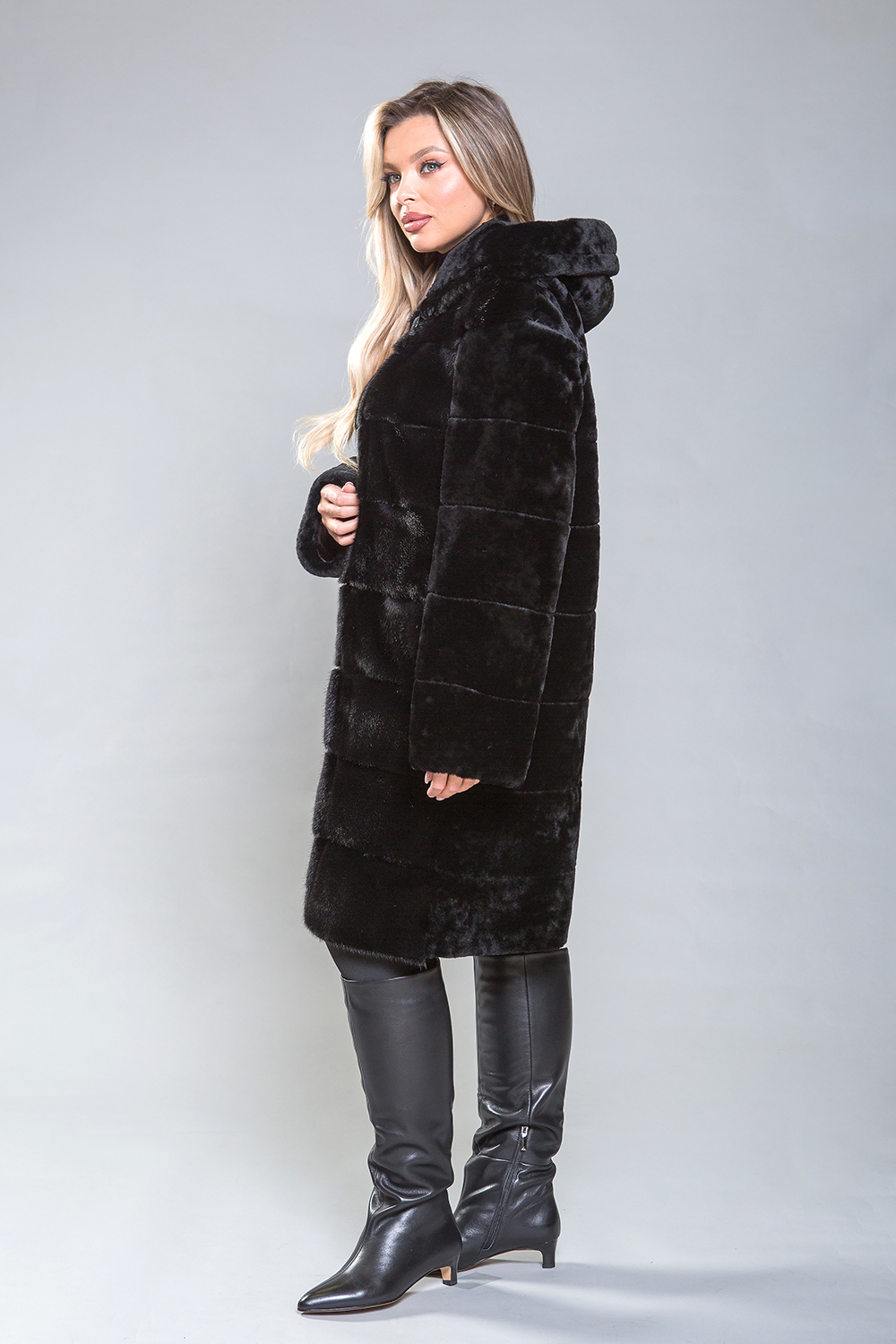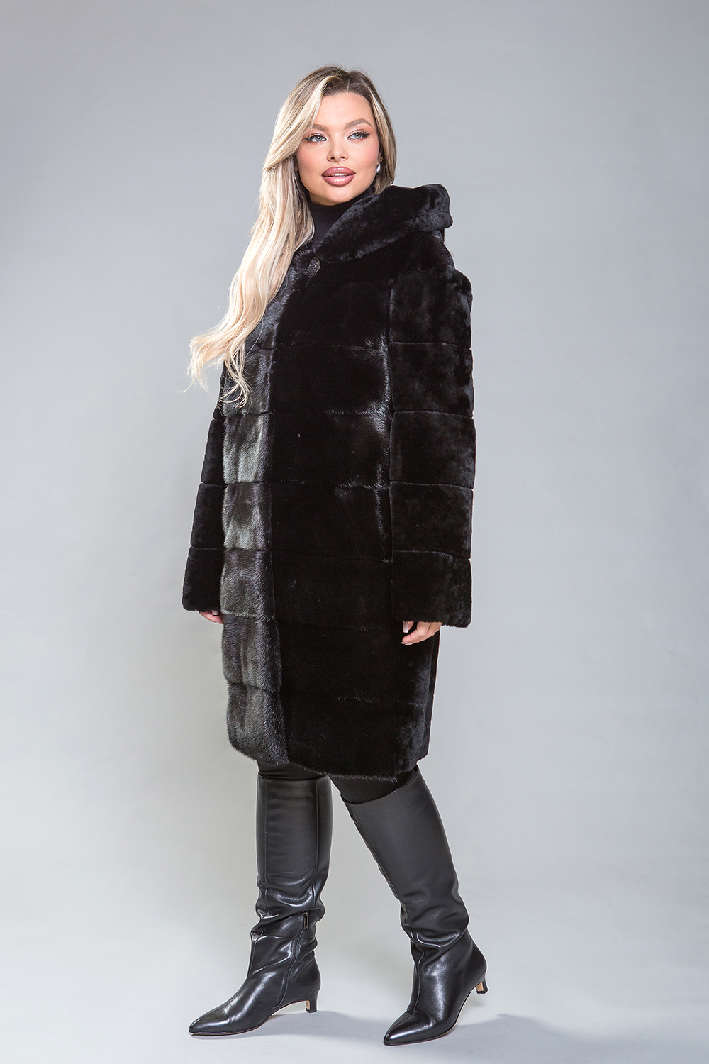 Полупальто из премиальной овчины с капюшоном, украшенное роскошной норкой на передней части и плечах. Шубка изготовлена из поперечных пластин овчины, а карманы и борта выполнены из натуральной замши. Застежка — клипсы. Длина изделия составляет 100 см. Элегантный черный цвет легко сочетается с любым стилем. Эта шубка не только обеспечивает тепло и комфорт, но и придает невероятный шарм!