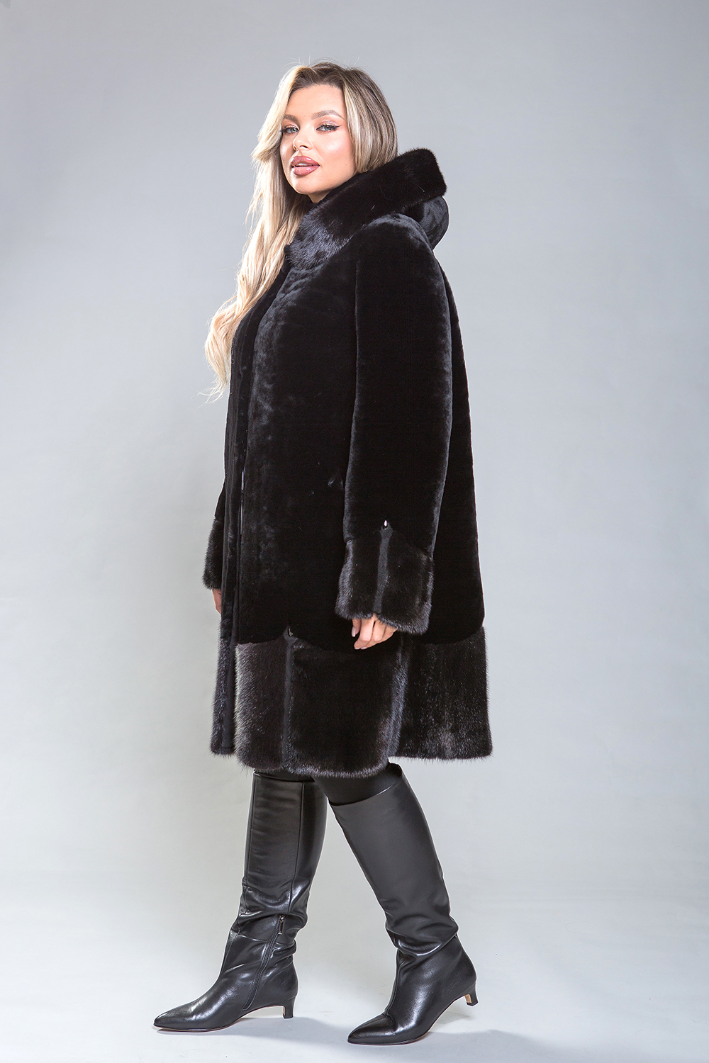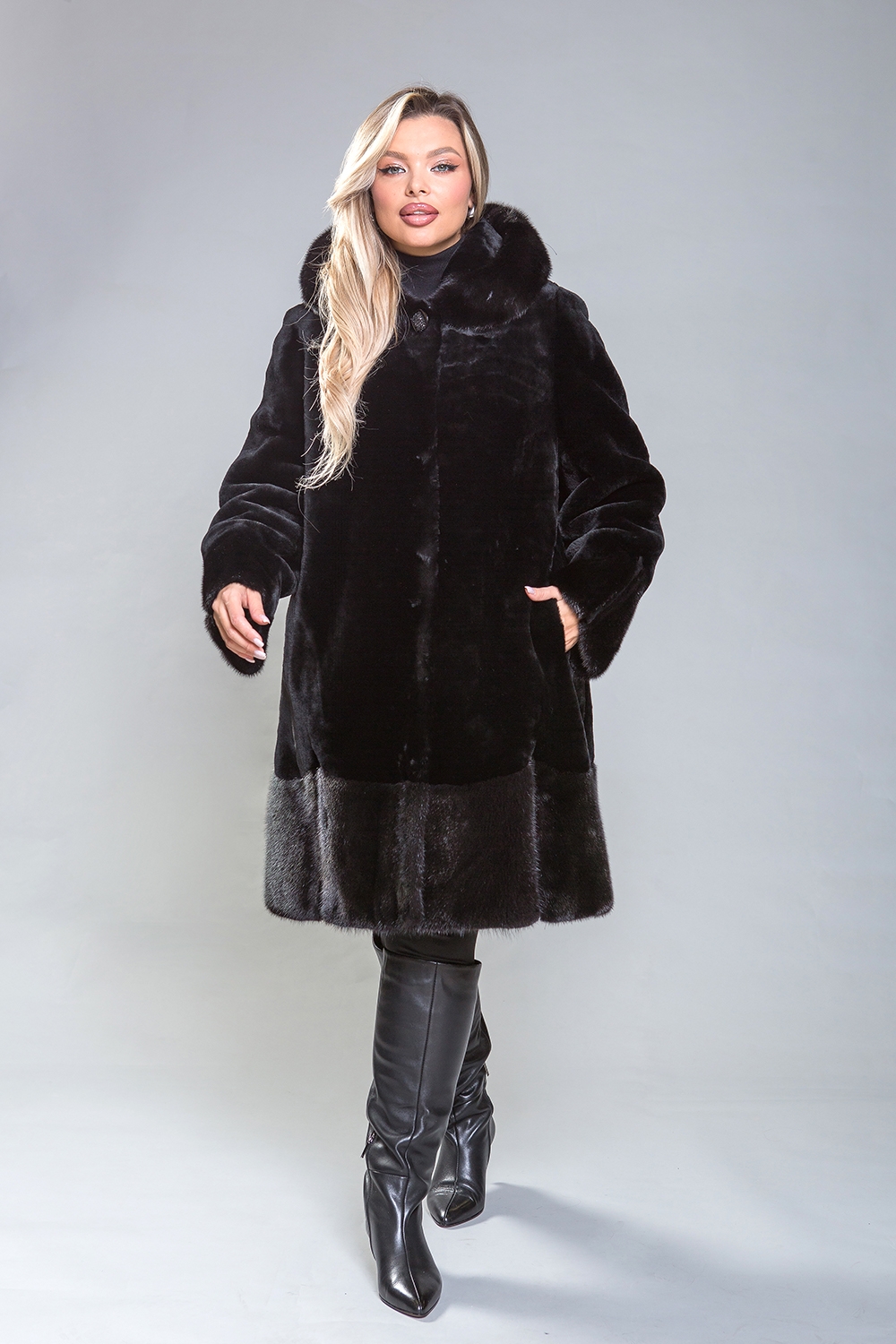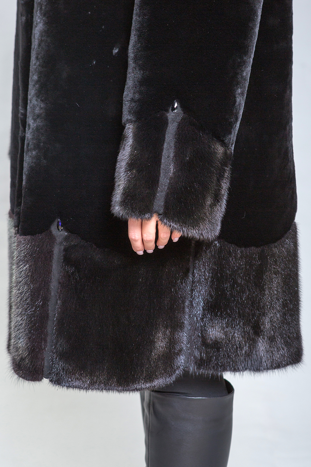 Элегантное полупальто из высококачественной овчины с утонченными деталями. Рукава, капюшон и подол выполнены из норки, украшенной миниатюрными стеклярусами. Роскошная овчина премиум-класса гарантирует тепло и комфорт, оставаясь эффективной даже при повышенной влажности. Капюшон застегивается на пуговицу, а шуба фиксируется металлическими клипсами. Карманы и борта полупальто изготовлены из натуральной замши. Длина изделия — 100 сантиметров, что делает его удобным для повседневного ношения. Легкий вес и отличная теплоизоляция делают это полупальто важным элементом гардероба.