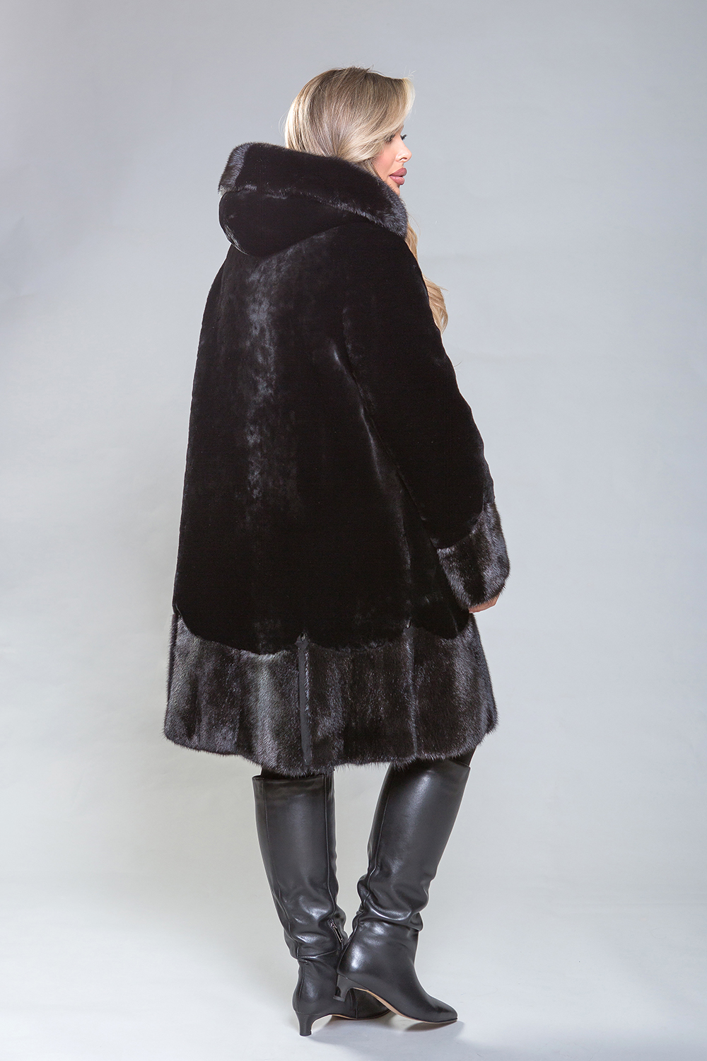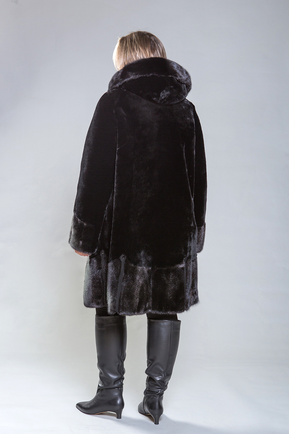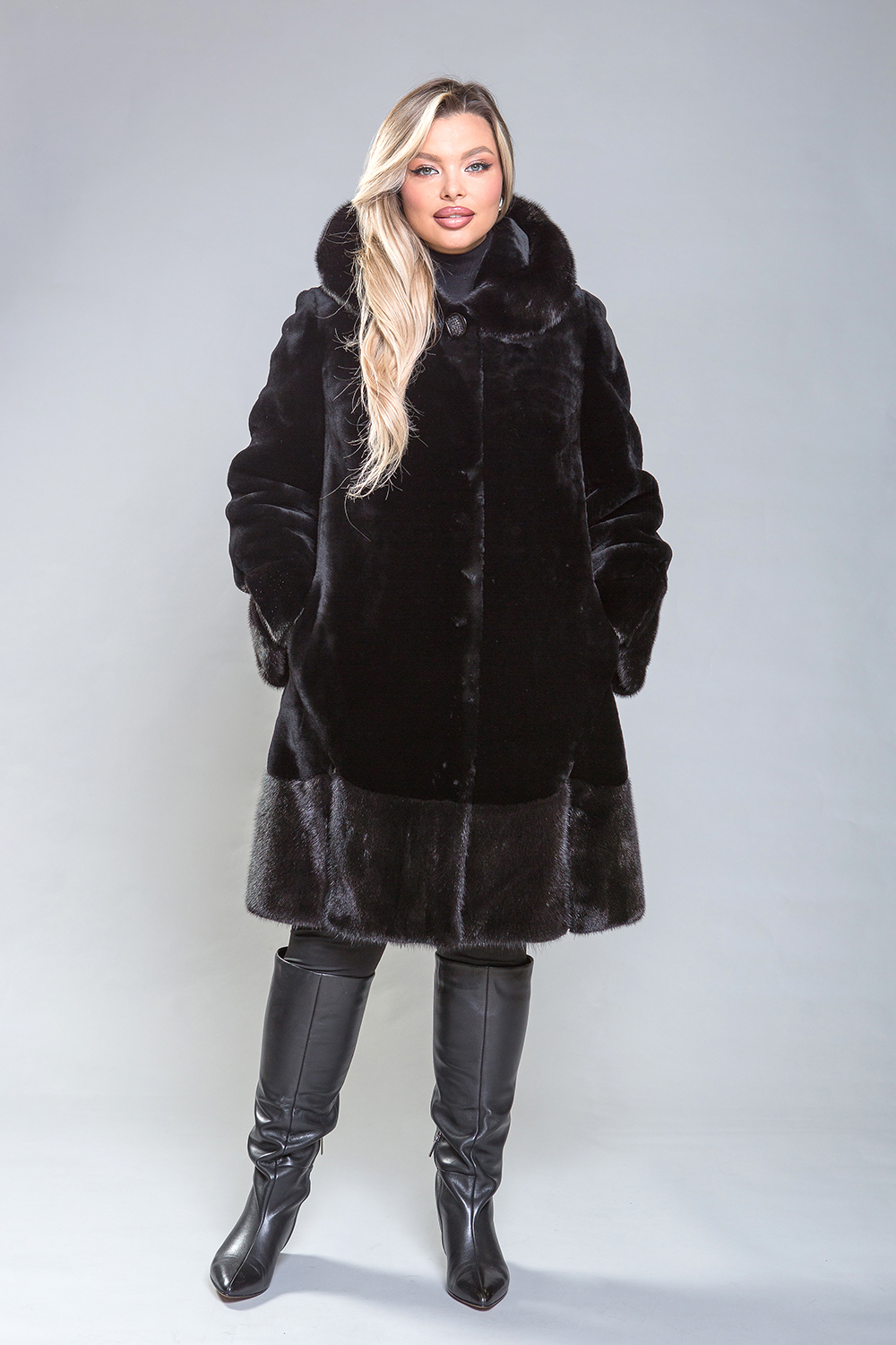 Элегантное полупальто из высококачественной овчины с утонченными деталями. Рукава, капюшон и подол выполнены из норки, украшенной миниатюрными стеклярусами. Роскошная овчина премиум-класса гарантирует тепло и комфорт, оставаясь эффективной даже при повышенной влажности. Капюшон застегивается на пуговицу, а шуба фиксируется металлическими клипсами. Карманы и борта полупальто изготовлены из натуральной замши. Длина изделия — 100 сантиметров, что делает его удобным для повседневного ношения. Легкий вес и отличная теплоизоляция делают это полупальто важным элементом гардероба.