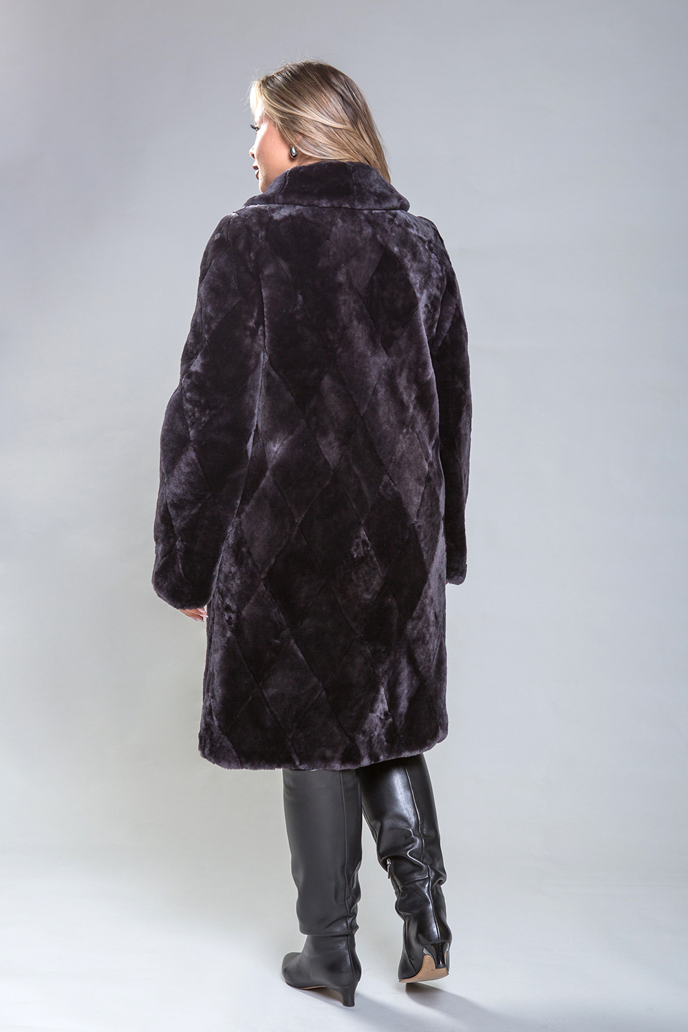 Полупальто из овчины — стильная и практичная модель. Воротник фиксируется на пуговицу, а шубка застегивается на клипсы. Длина изделия составляет 100 см. Модель изготовлена из пластинок овчины, выложенных в форме ромбов. Это универсальное решение, подходящее для любого типа фигуры. Профессиональные стилисты отмечают, что классический силуэт полупальто добавляет образу элегантности и утонченности.