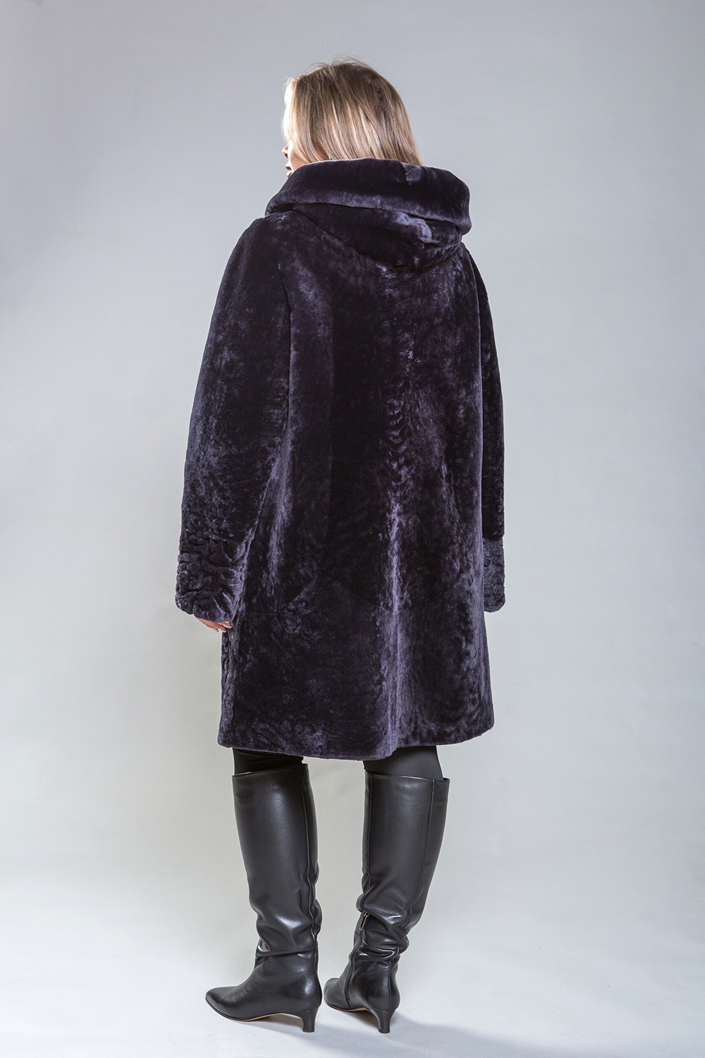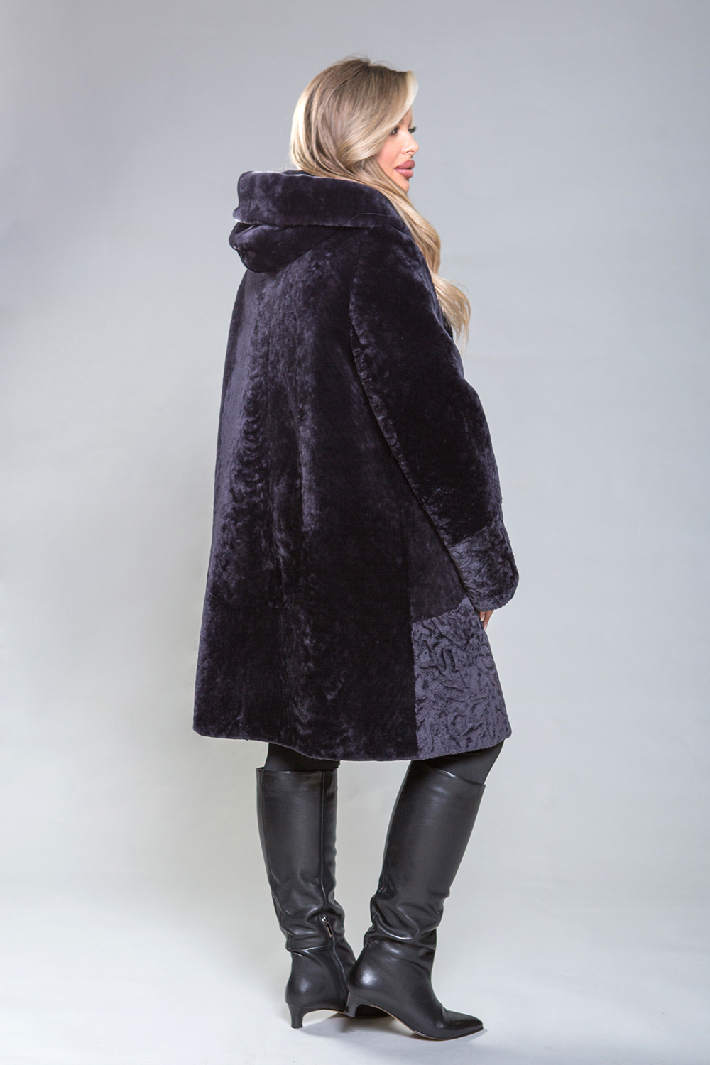 Полупальто из натуральной овчины с капюшоном и изысканной выстрижкой. На передней части и по кромке рукавов расположены геометрические узоры, выполненные в вертикальной композиции. Капюшон надежно крепится пуговицей, а само полупальто фиксируется клипсами. Карманы и борта модели изготовлены из натуральной замши. Современная посадка изделия визуально корректирует фигуру, скрывая недостатки. Длина полупальто составляет 100 см, что обеспечивает идеальную посадку на любой тип фигуры, подчеркивая стиль и элегантность.