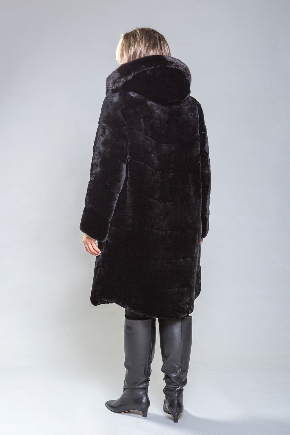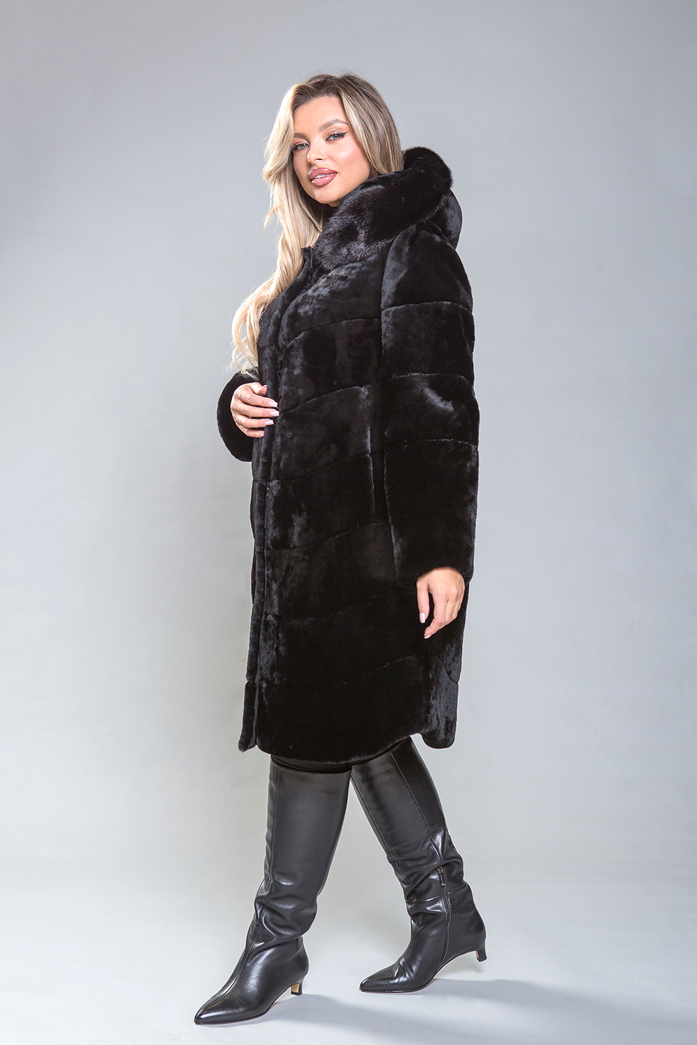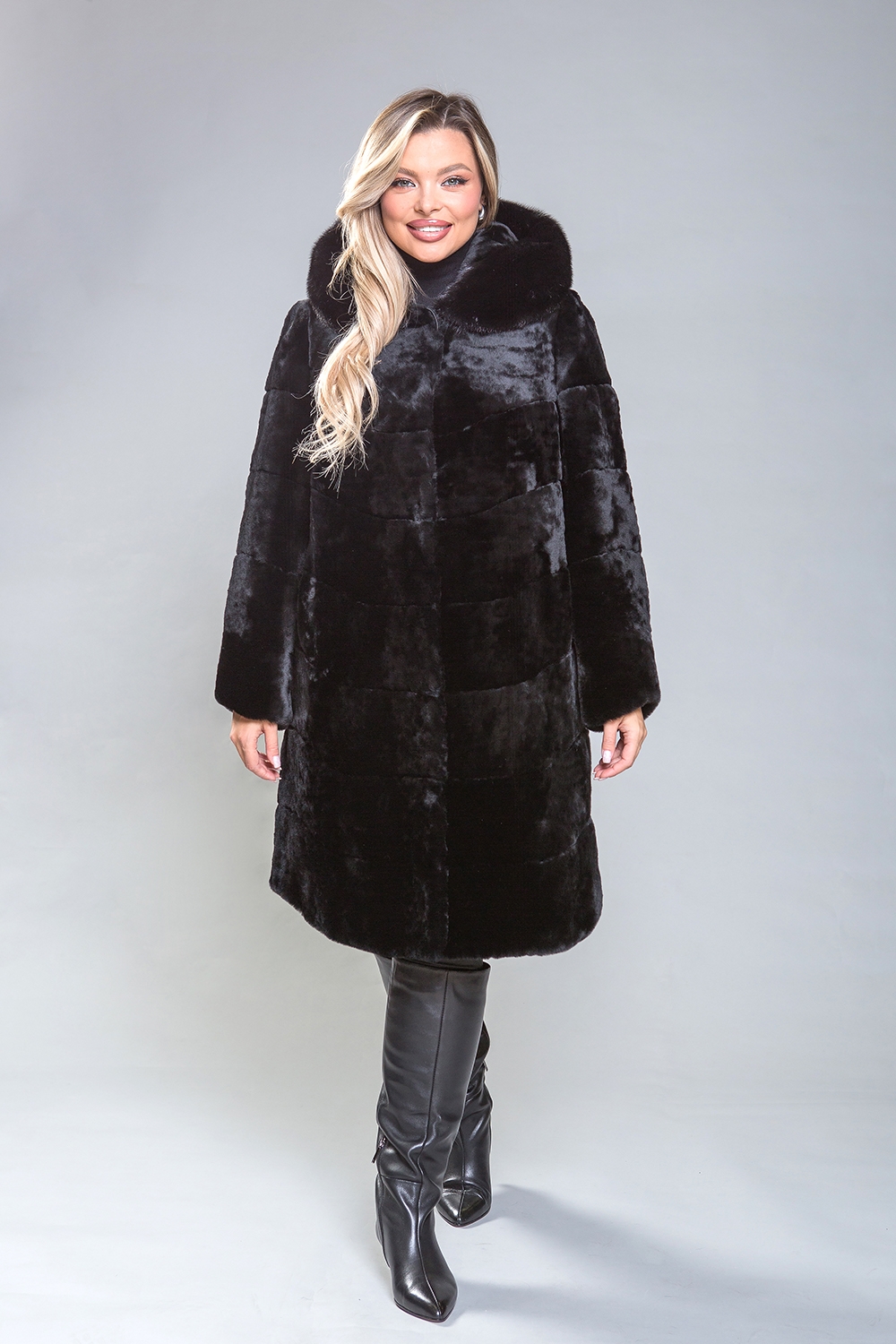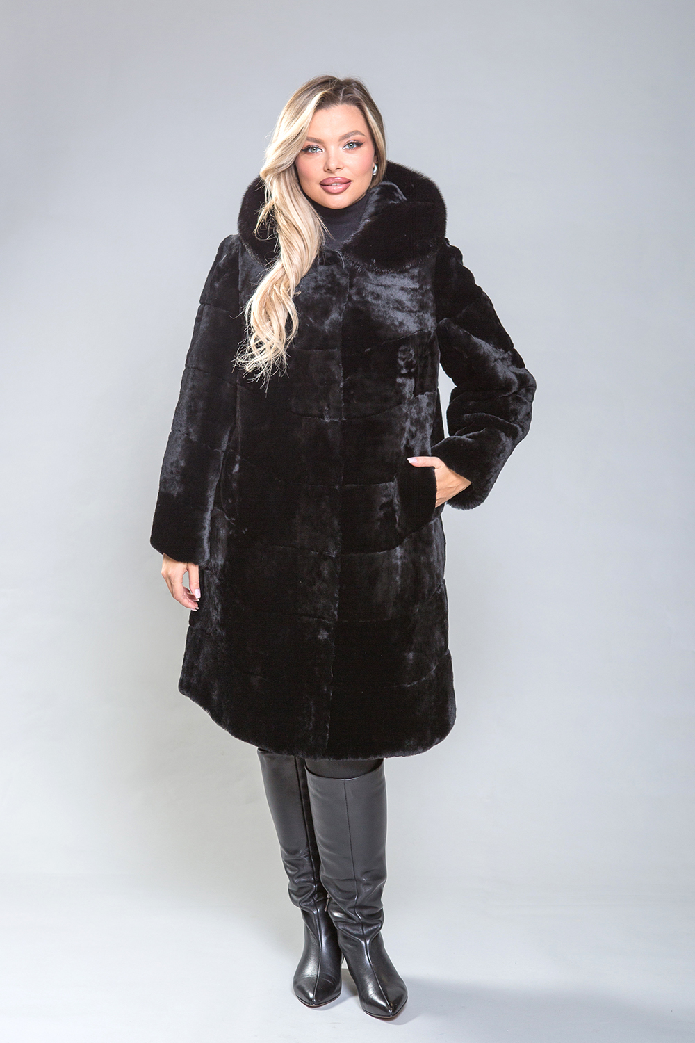 Полупальто из высококачественной овчины с капюшоном из норки выполнено по технологии диагональной выкладки пластин. Капюшон фиксируется на пуговицу, а само пальто — на клипсы. Длина изделия составляет 100 см. Прямой крой подходит для любого типа фигуры, обеспечивая удобство и комфорт.