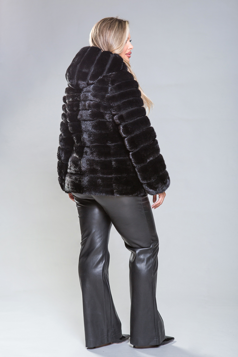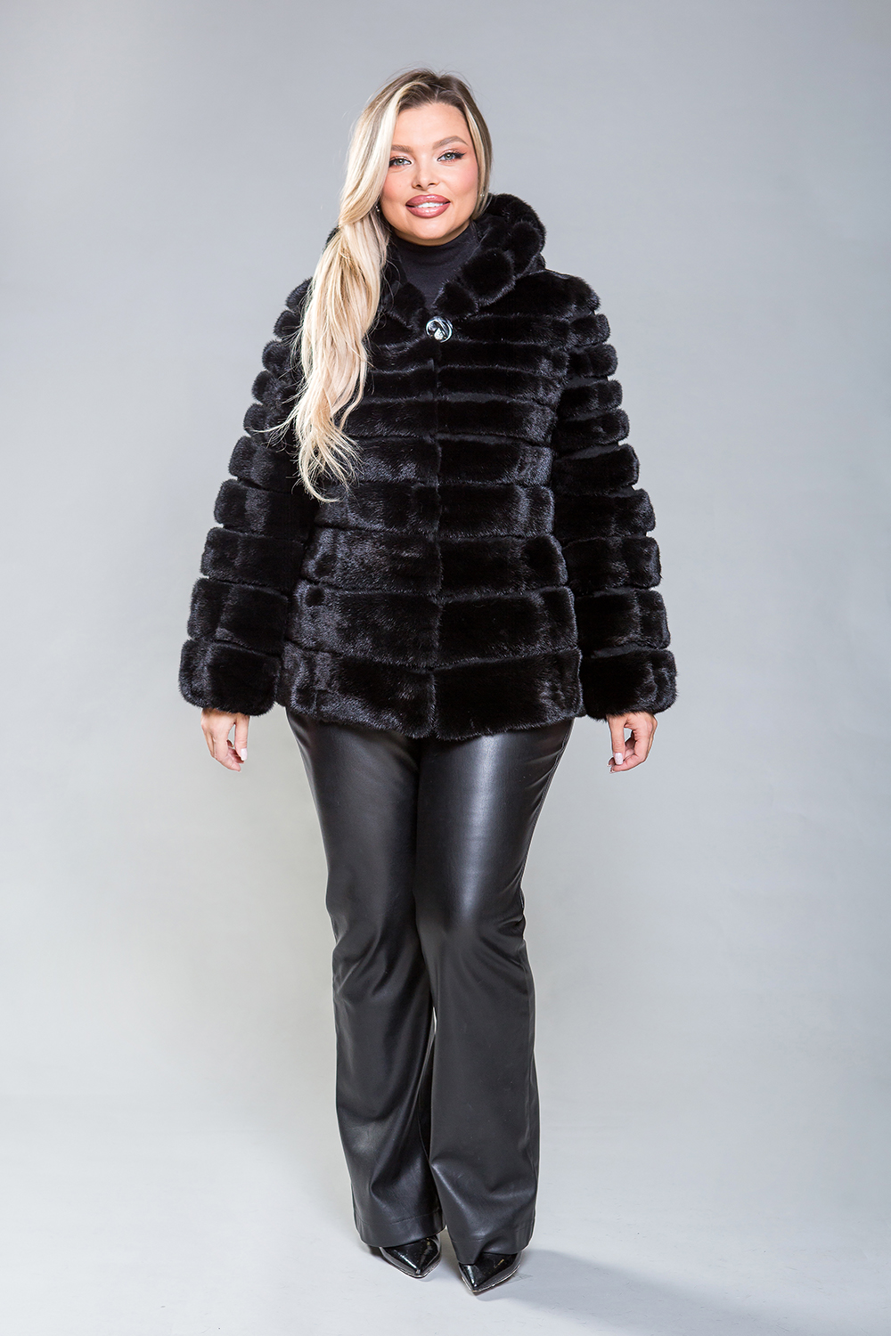 Норковая курточка с капюшоном, сшитая из пластинок меха норки и натуральной замши, дополнена удобными кармашками с магнитными застежками. Длина изделия составляет 70 сантиметров. Эта шубка прекрасно сочетается как с юбками разной длины, так и с брюками — от свободных до облегающих моделей.