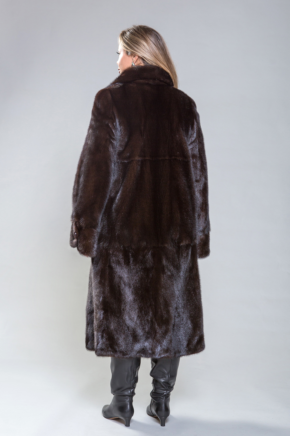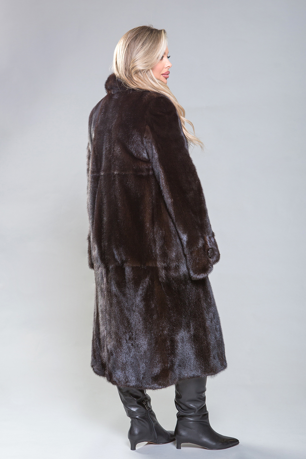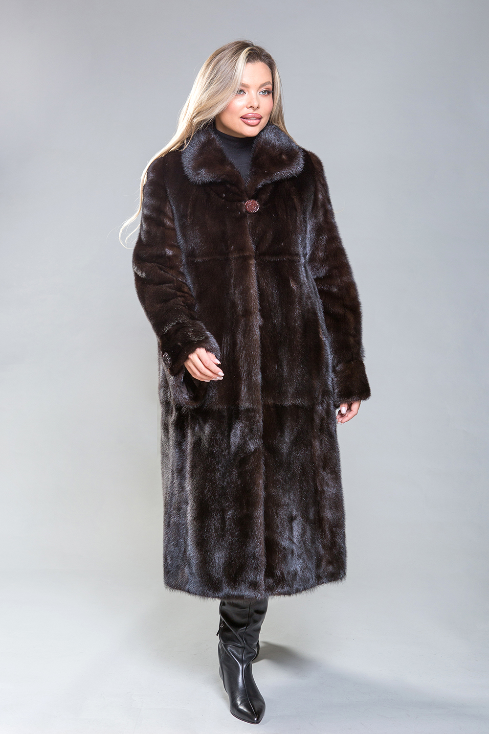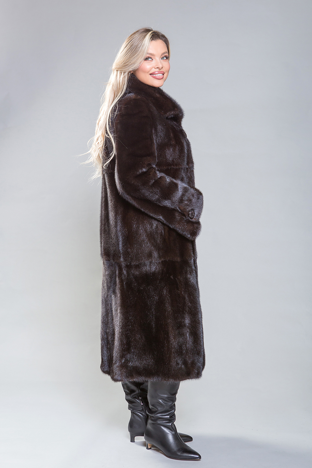 Полупальто из норки с классическим воротником, созданное из пластин с добавлением роспуска, является универсальным вариантом. Длина изделия составляет 120 сантиметров. По мнению профессиональных стилистов, шуба классического силуэта — это безошибочный выбор. Модель идеально садится на любую фигуру и обеспечивает элегантный внешний вид.