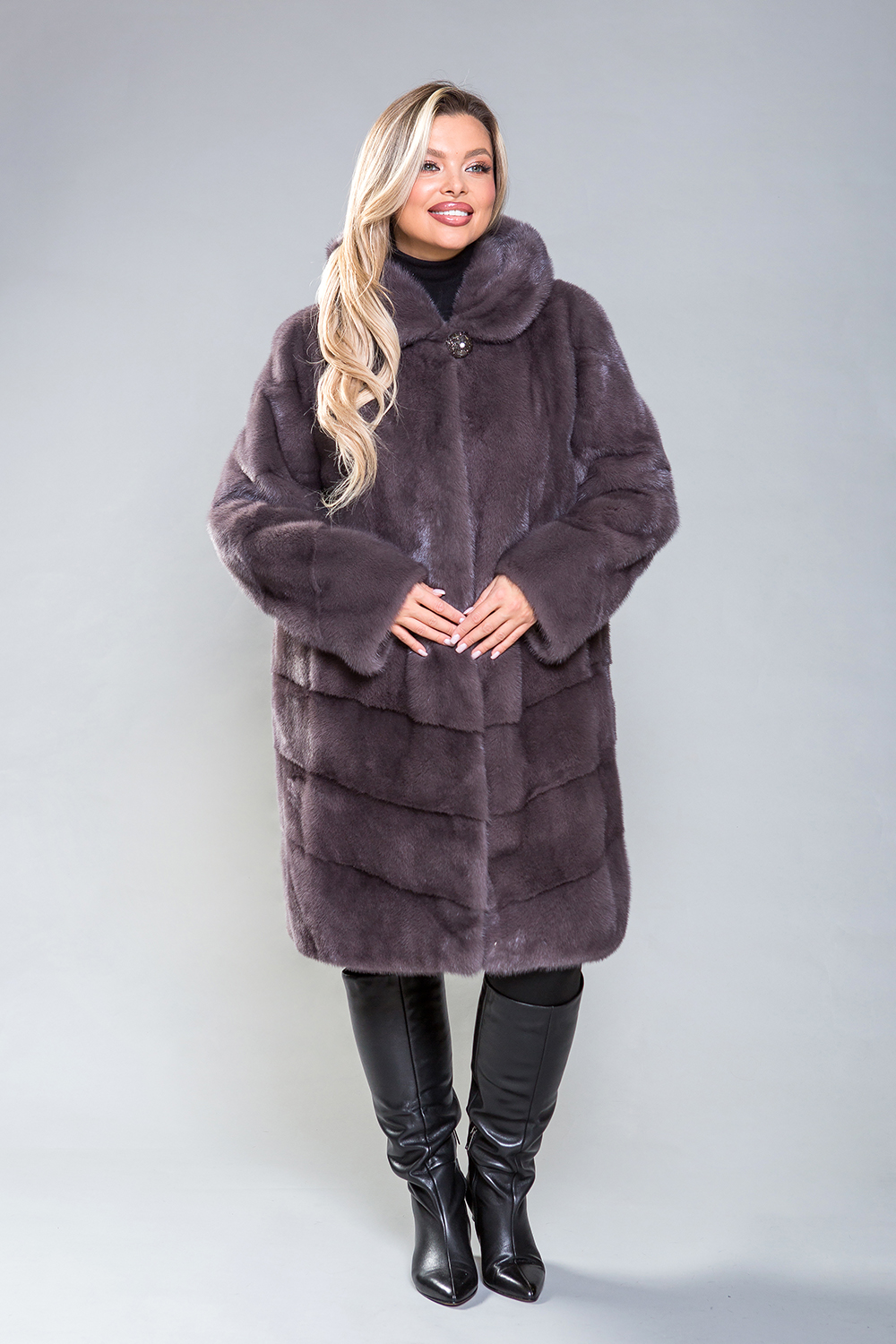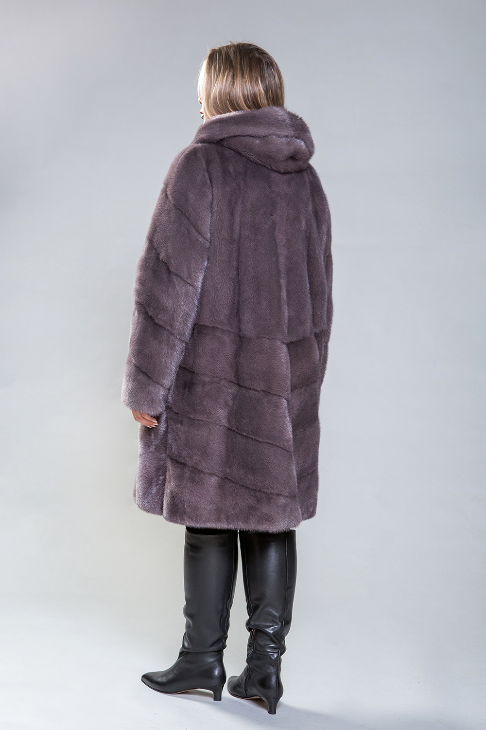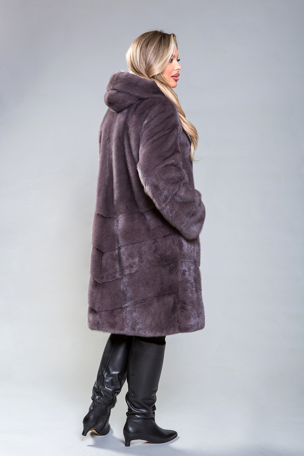 Полупальто из норкового меха с капюшоном. Модель имеет комбинированный крой: верх выполнен в технике роспуска, а низ и рукава — из диагонально выложенных пластин. Изделие оснащено регулируемыми утяжками на талии, рукавах и внизу. Длина полупальто составляет 100 см. Этот элегантный полушубок в сдержанном грифельном цвете идеально подойдет как блондинкам, так и брюнеткам!