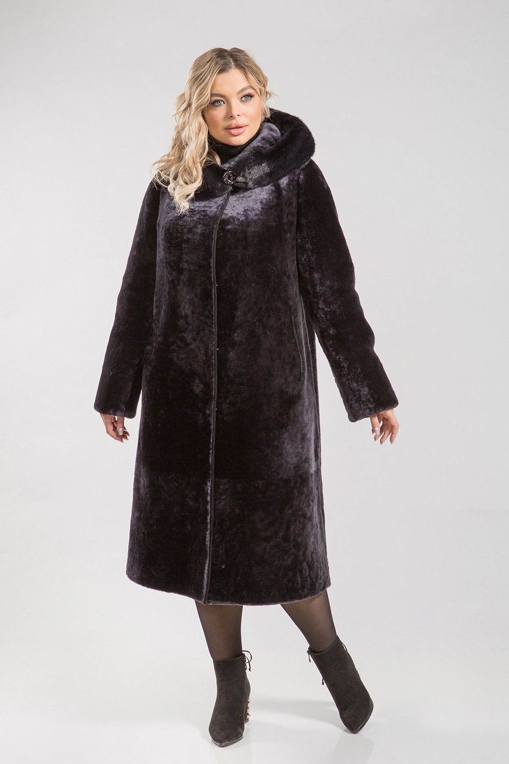 Полупальто, выполненное из меха овчины, дополнено капюшоном, украшенным норковым мехом. Рукава изделия могут быть подвернуты в манжеты и укорочены в зависимости от индивидуальных предпочтений. Кармашки и борта полупальто оформлены натуральной кожей. Длина изделия составляет 115 сантиметров.