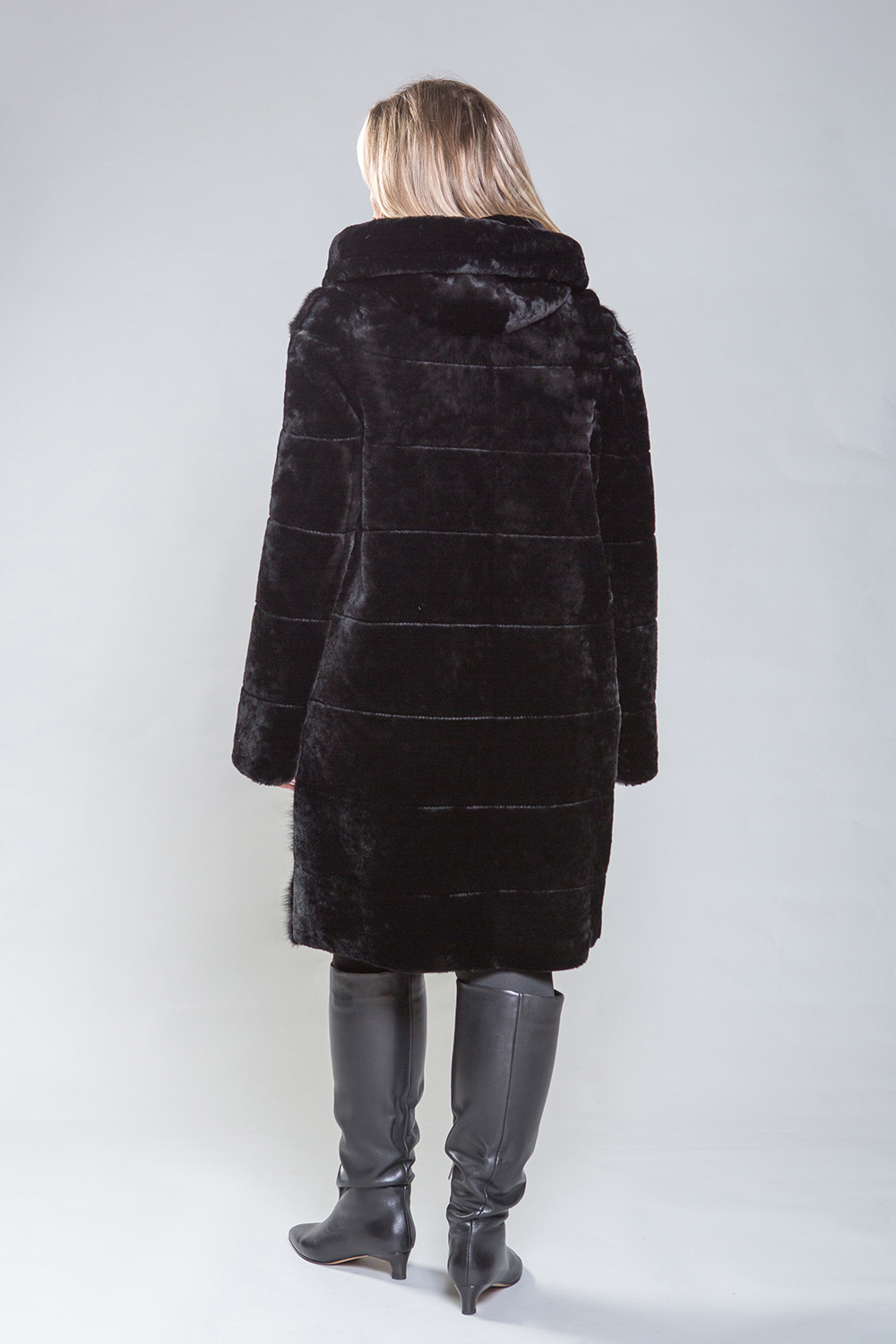 Полупальто из премиальной овчины с капюшоном, украшенное роскошной норкой на передней части и плечах. Шубка изготовлена из поперечных пластин овчины, а карманы и борта выполнены из натуральной замши. Застежка — клипсы. Длина изделия составляет 100 см. Элегантный черный цвет легко сочетается с любым стилем. Эта шубка не только обеспечивает тепло и комфорт, но и придает невероятный шарм!