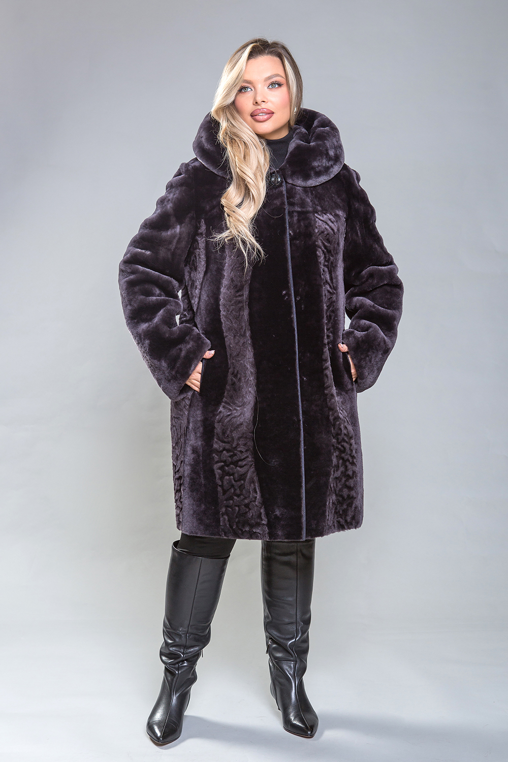 Полупальто из овчины с капюшоном. Модель декорирована вертикальной узорной выстрижкой спереди и по бокам. Капюшон застегивается на пуговицу, а шубка — на клипсы. Этот современный фасон визуально уменьшает объемы и скрывает проблемные зоны. Длина полупальто — 95 см. Оно легкое, уютное и комфортное.
