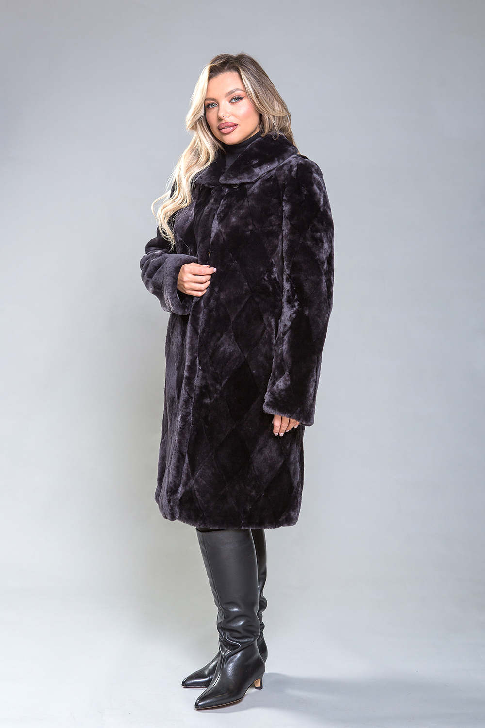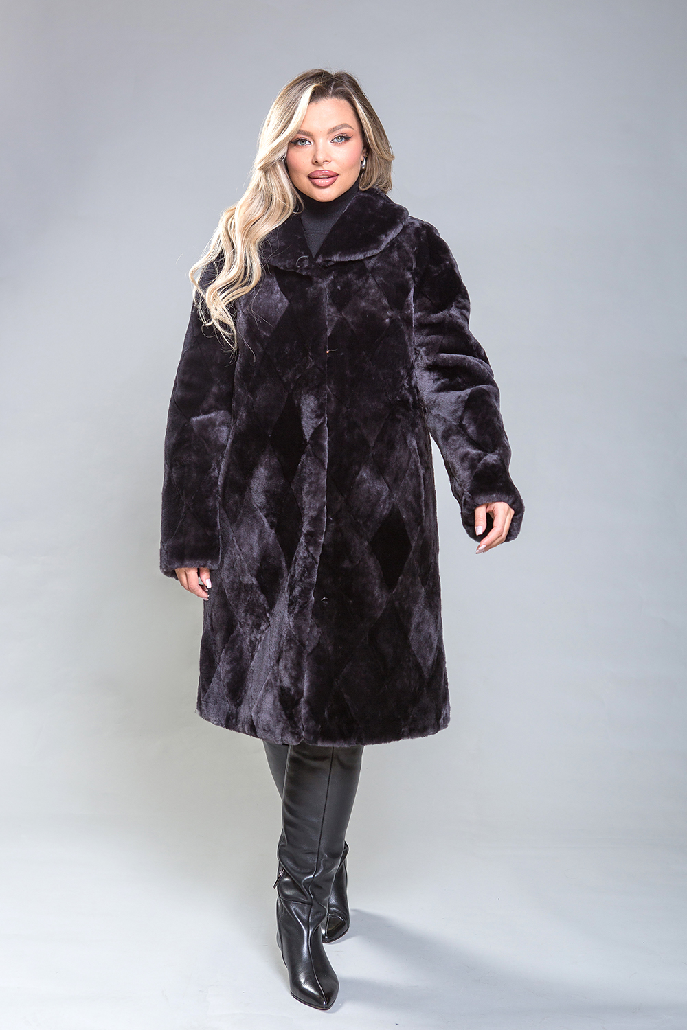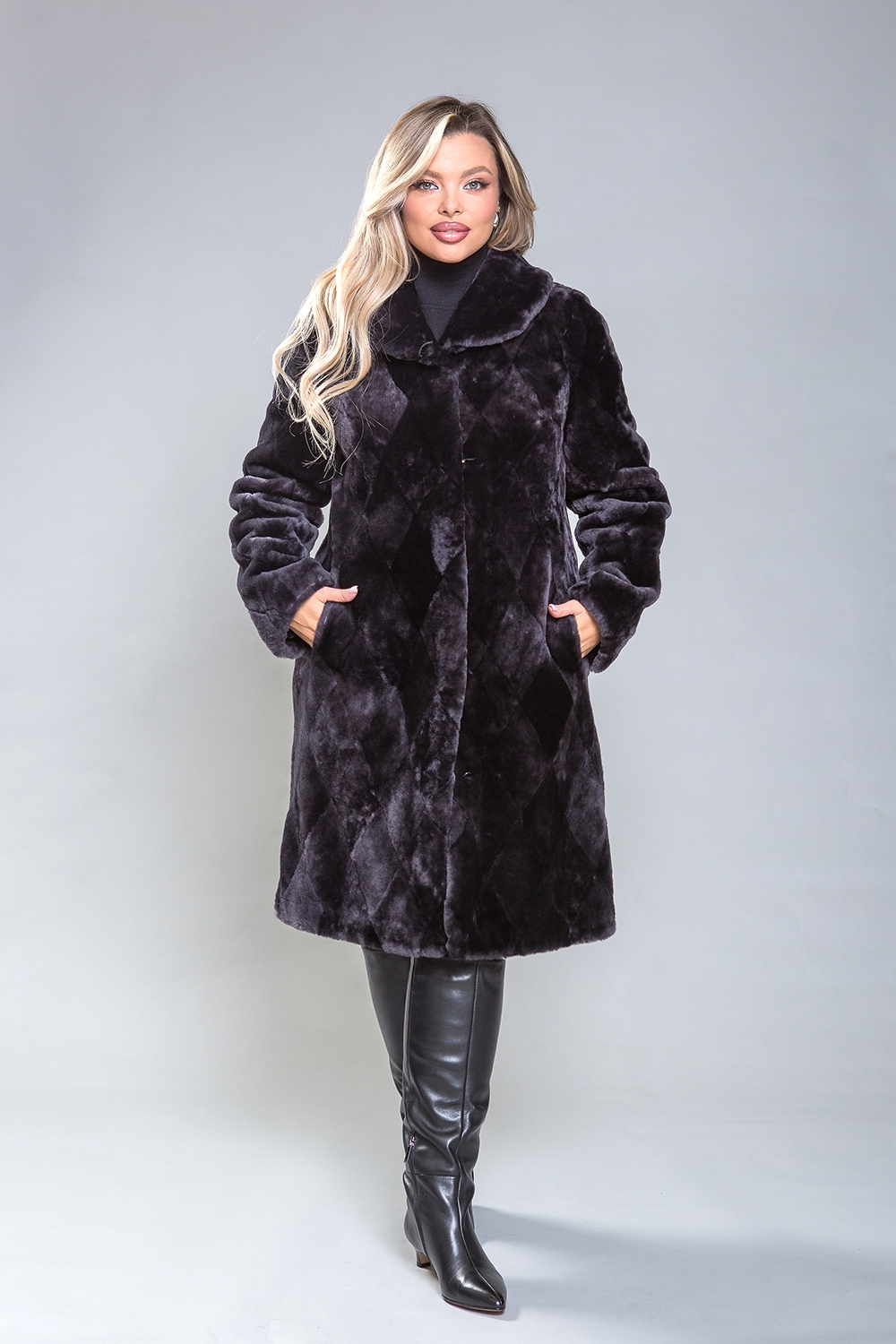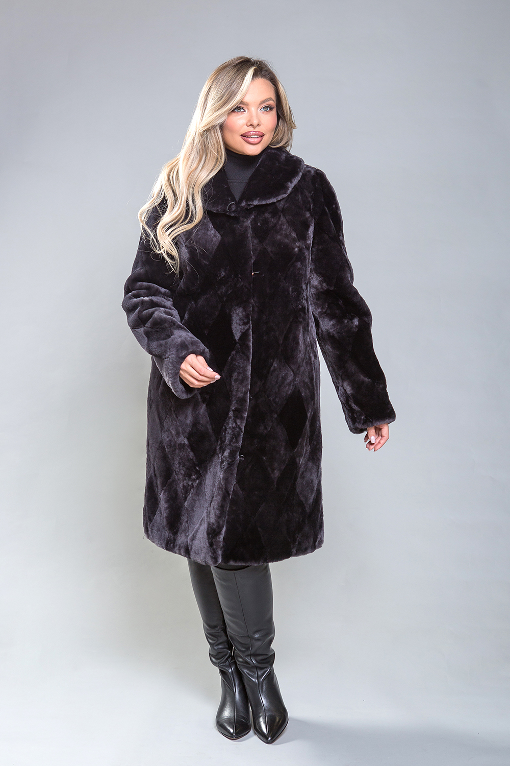 Полупальто из овчины — стильная и практичная модель. Воротник фиксируется на пуговицу, а шубка застегивается на клипсы. Длина изделия составляет 100 см. Модель изготовлена из пластинок овчины, выложенных в форме ромбов. Это универсальное решение, подходящее для любого типа фигуры. Профессиональные стилисты отмечают, что классический силуэт полупальто добавляет образу элегантности и утонченности.