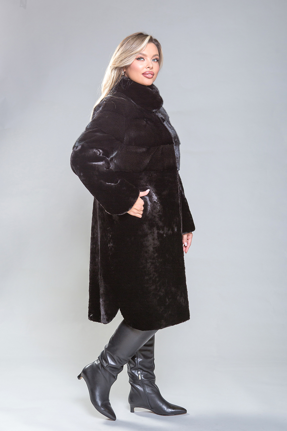 Полупальто из премиальной овчины с элегантным воротником-стойкой. Передняя и задняя части до талии, а также верхняя часть рукавов украшены изысканной норкой, выполненной из поперечных пластин. Модель отличается изящными закругленными разрезами на рукавах и подоле. Длина изделия — 100 см. Благородный оттенок шоколада легко впишется в любой образ. Это воплощение роскоши высшего класса!