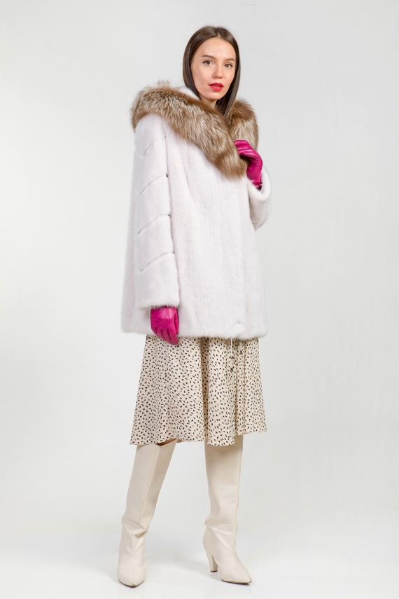 Куртка из меха норки. Капюшон модели декорирован мехом лисы. По низу и на рукавах изделия - регулирующие утяжки. Шикарный капюшон, благородный мех шубки подчеркивает статус успешной леди!