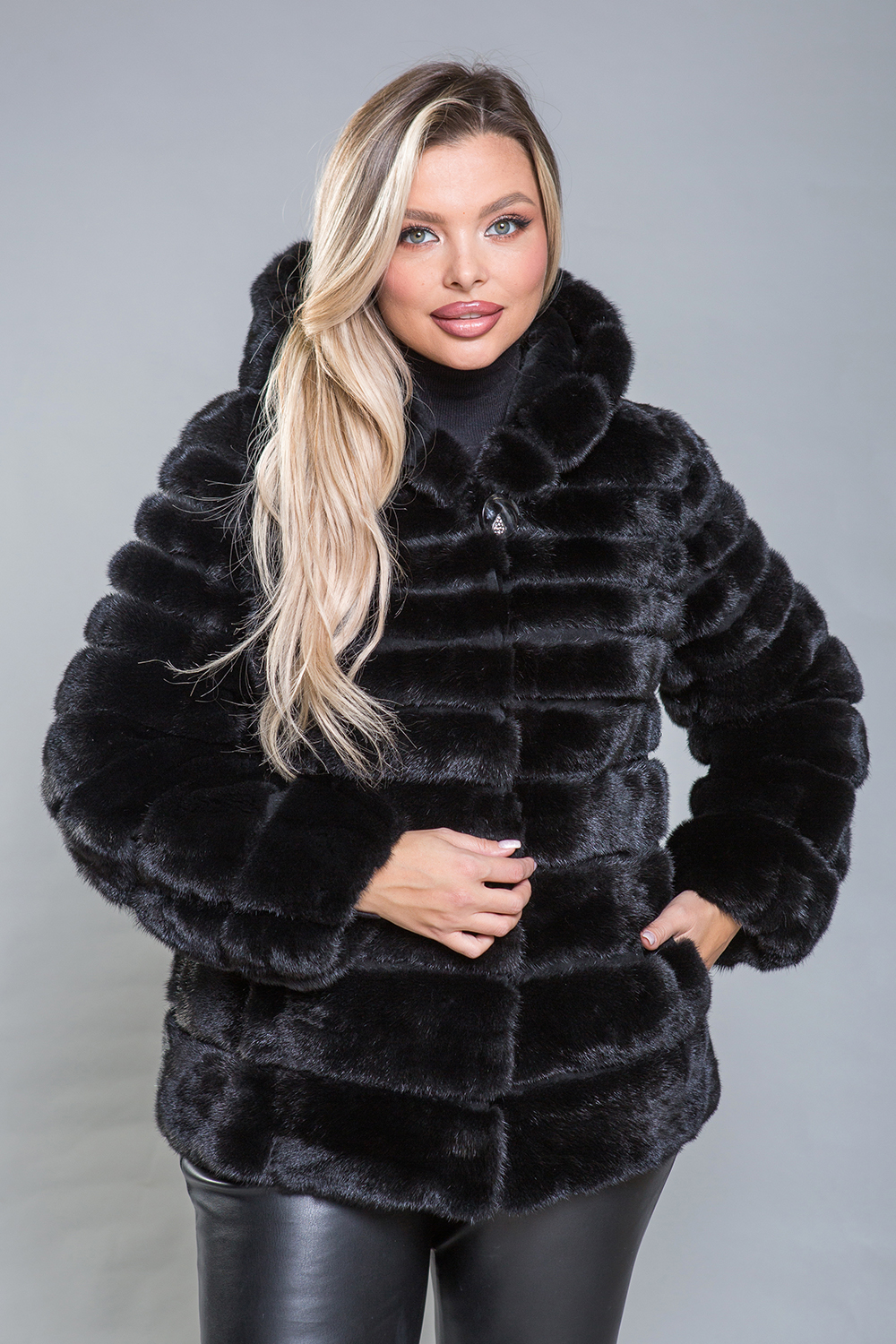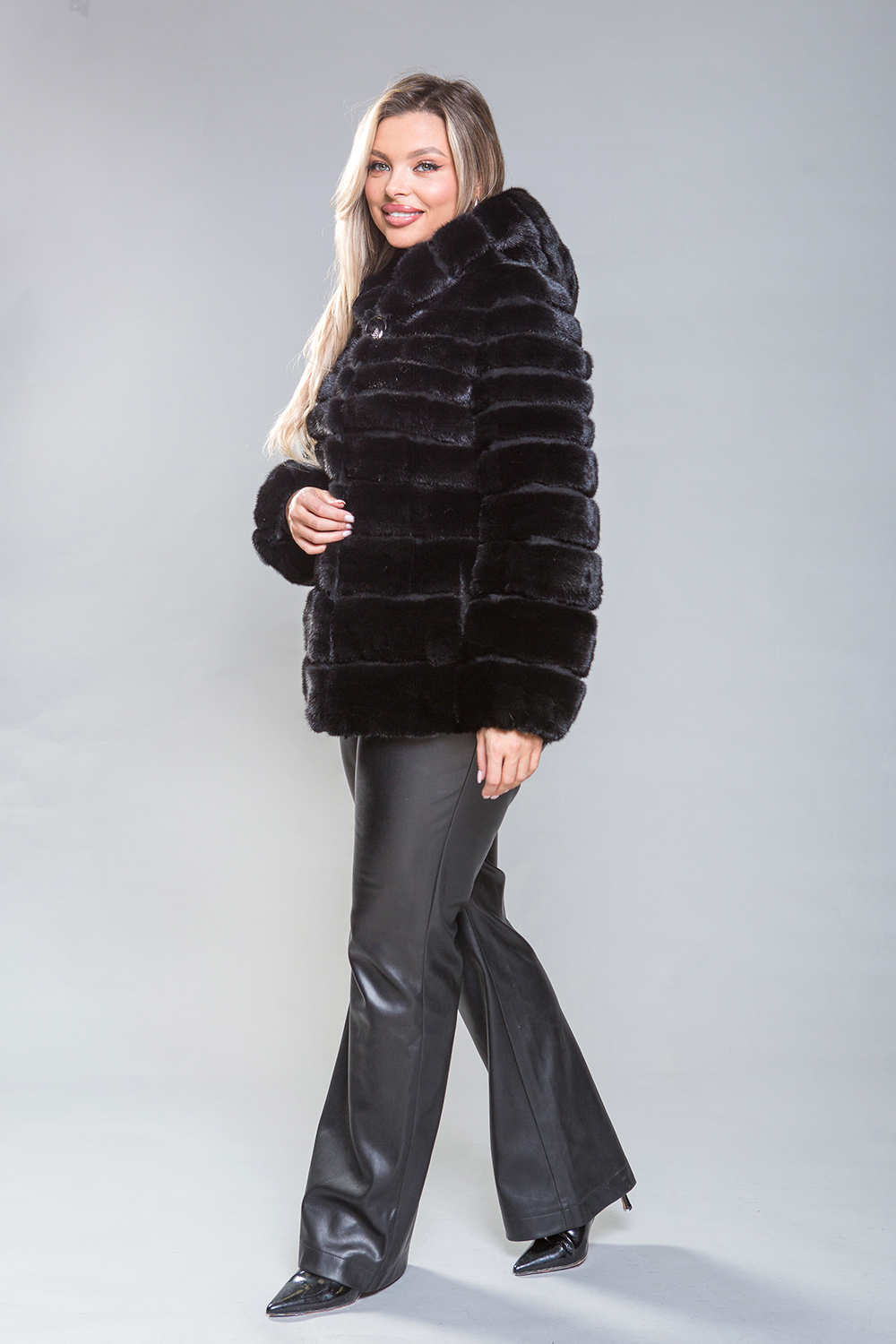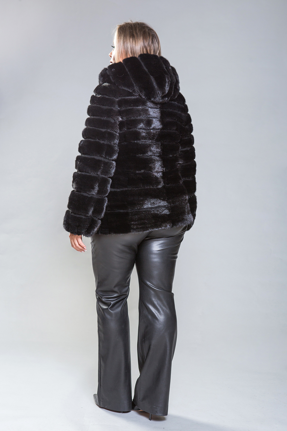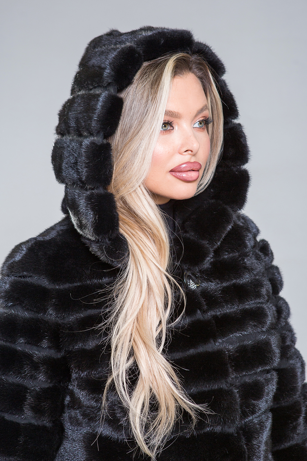 Норковая курточка с капюшоном, сшитая из пластинок меха норки и натуральной замши, дополнена удобными кармашками с магнитными застежками. Длина изделия составляет 70 сантиметров. Эта шубка прекрасно сочетается как с юбками разной длины, так и с брюками — от свободных до облегающих моделей.