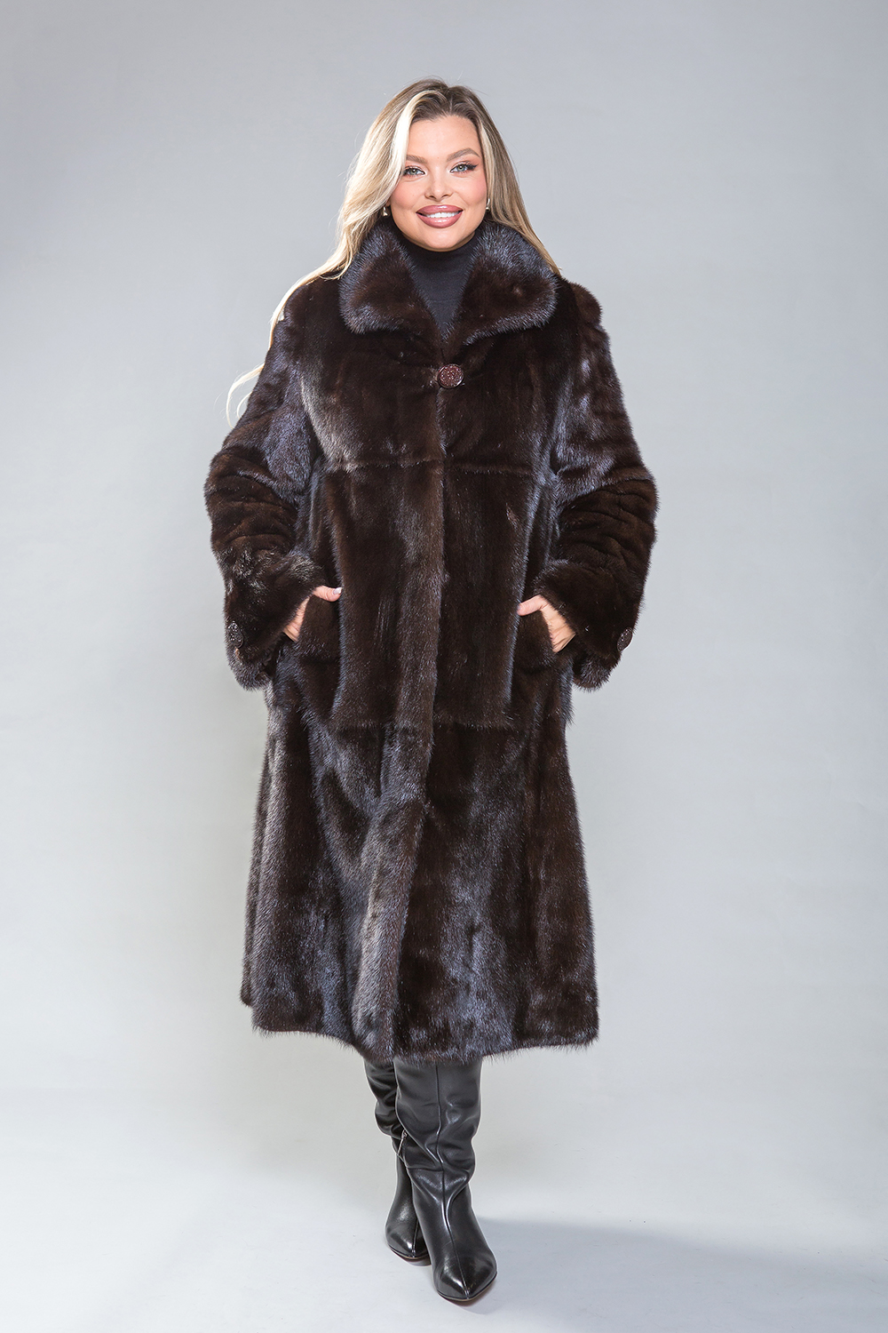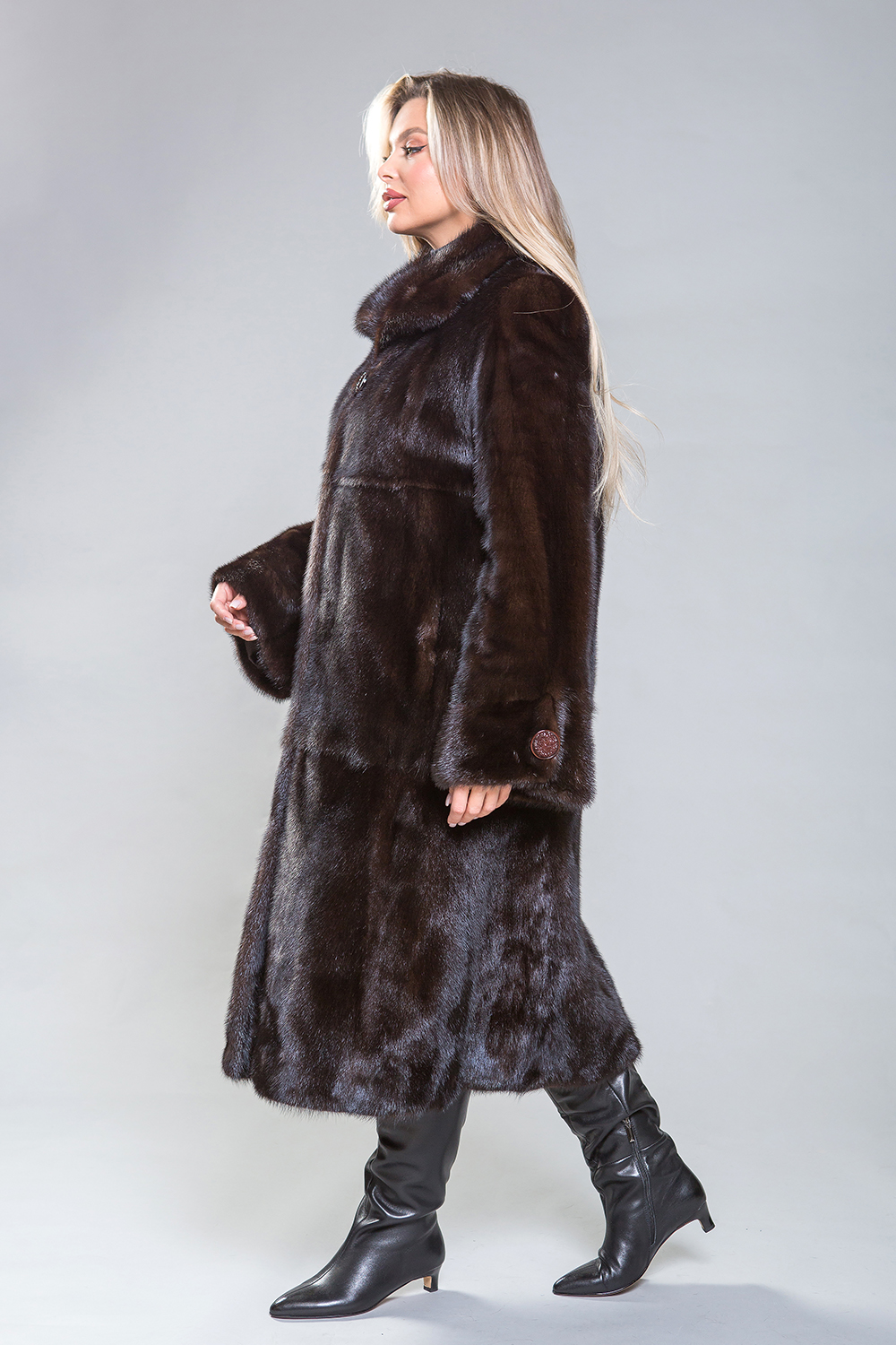Полупальто из норки с классическим воротником, созданное из пластин с добавлением роспуска, является универсальным вариантом. Длина изделия составляет 120 сантиметров. По мнению профессиональных стилистов, шуба классического силуэта — это безошибочный выбор. Модель идеально садится на любую фигуру и обеспечивает элегантный внешний вид.