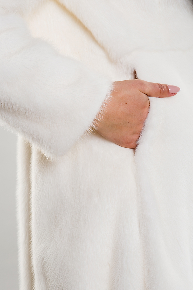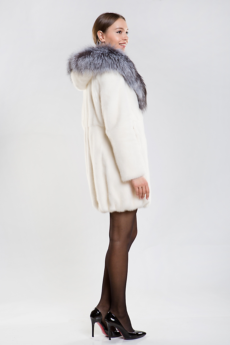 Полупальто из меха норки. Шикарный капюшон изделия декорирован мехом чернобурой лисы. Низ модели слегка присобран. На талии и на рукавах шубки регулирующие утяжки. Длина изделия 90 см. Такая миниатюрная модель смотрится достаточно изящно и по-королевски привлекательно!