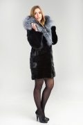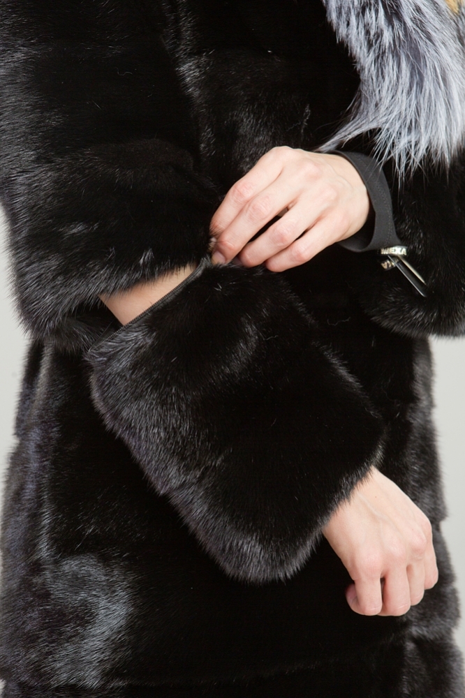 Полупальто женское из меха норки. Капюшон изделия дополнен мехом чернобурой лисы. Крой изделия - поперечная выкладка пластин. Длина шубки 90 см. Рукава и низ модели отстегиваются. Изделие трансформируется в куртку. Это очень удобно, оригинально и практично.