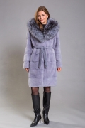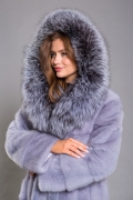 Полупальто из меха норки с капюшоном, украшенным роскошным мехом лисы. Модель выполнена из поперечно выложенных пластин, что обеспечивает её изящество и элегантность. Особенностью этого полупальто являются регулирующие утяжки на рукавах, талии и по низу изделия, что позволяет идеально подобрать размер. Длина шубки составляет 100 см, а рукава можно сделать более укороченными, что делает её ещё более удобной в носке. В комплекте к шубке идёт меховой пояс из меха норки, который придаёт образу изысканность и неповторимость. Нежно-голубой цвет изделия делает его особенно свежим и моложавым, а уютный капюшон обеспечивает комфорт и изящество. Будьте неотразимы в новом норковом пальто!