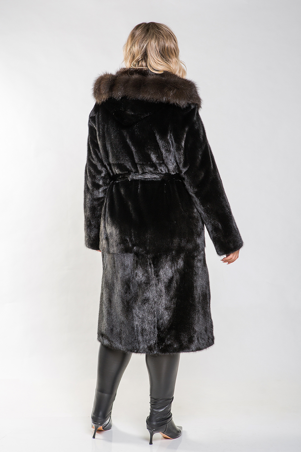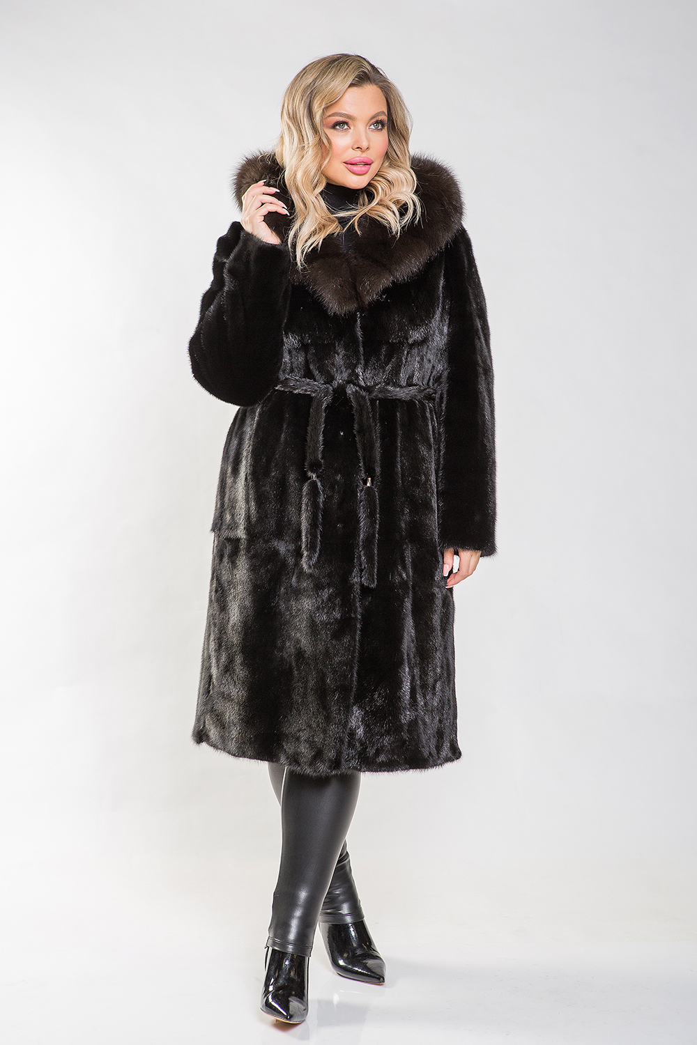 Полупальто, выполненное из меха норки, дополнено капюшоном, украшенным мехом куницы, который искусно имитирует благородный цвет соболя. Модель кроится из пластин с роспуском, что обеспечивает её гибкость и удобство. Рукава оснащены регулирующими утяжками. Длина модели составляет 110 см. Меховой пояс позволяет подчеркнуть стройность и элегантность силуэта. Шубка прекрасно впишется в строгий классический стиль, а её изюминкой являются разрезы по бокам, придающие образу особый шарм. Если вы хотите выглядеть роскошно и по-королевски, то натуральная норковая шубка с великолепным декором из куницы станет вашим идеальным выбором!