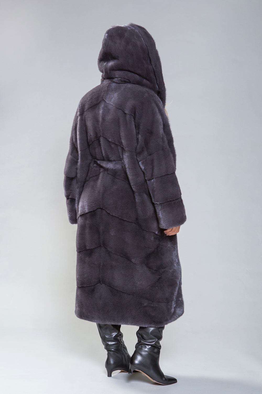 Полупальто из роскошной норки с капюшоном. Модель выполнена в технике диагональной выкладки пластин. Пояс, проходящий внутри изделия, подчеркивает фигуру. Карманы закрываются с помощью магнитов. Длина изделия составляет 120 см. Современный и элегантный дизайн модели визуально уменьшает объемы и скрывает недостатки фигуры. Это полупальто добавит уверенности и подчеркнет статус успешной женщины!