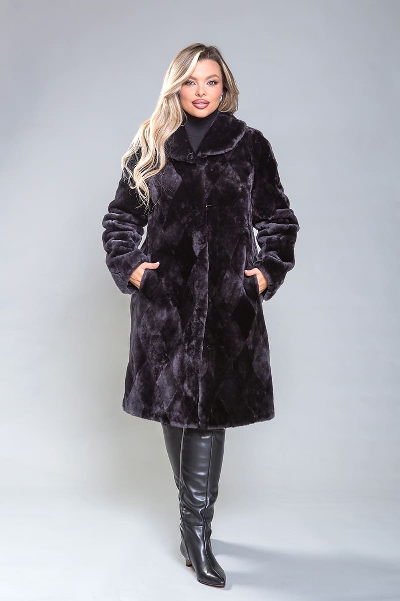 Полупальто этой модели отшито из овчины особой выделки, именуемой мутоном — меховые пластинки выложены ромбом, что придает изделию особую фактуру. Классический фасон А-силуэт делает его подходящим для любой фигуры. Практичность мутона позволяет носить полупальто и в мир, и в пир. Модель хорошо сочетается с повседневной и деловой одеждой. Универсальный цвет позволяет без труда подобрать аксессуары. Среди преимуществ изделия нужно выделить: